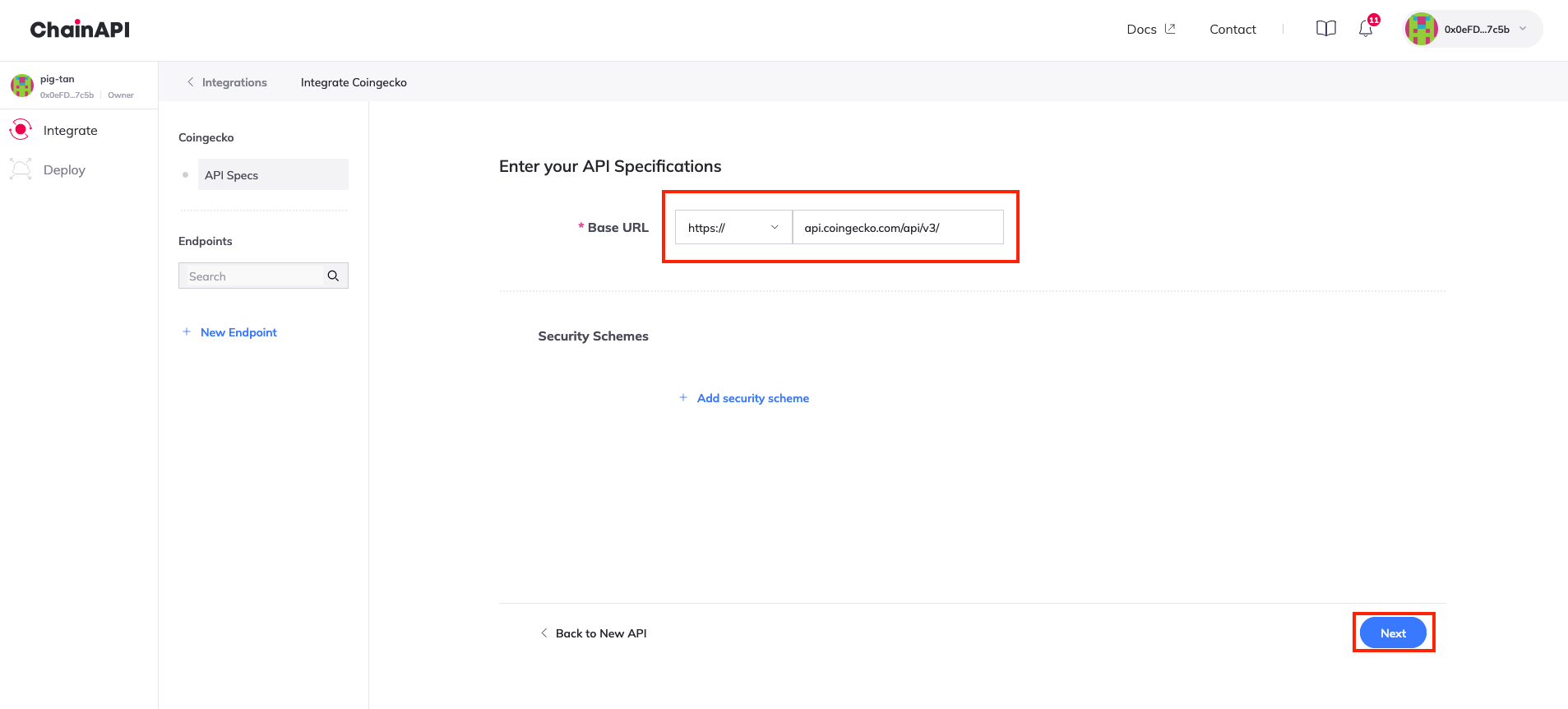 Enter the base URL for your API and click on Next. You can also add in support for security schemes like API keys or an HTTP bearer token by clicking on Add Security Scheme.